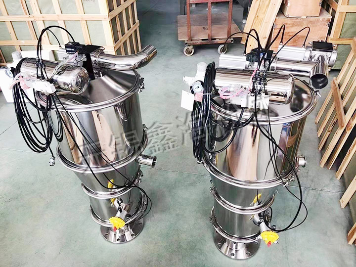 真空上料機是用旋渦氣泵抽氣,使吸料嘴進口處及整個系統處于一定的真空狀態,粉粒料隨同外界空氣被吸入料嘴,形成料氣流,經過吸料管到達料斗,在料斗中進行氣、料分離。分離后的物料進入受料設備。送料——放料是通過氣動三通閥不斷地開、閉來完成的,而氣動三通閥的開閉是由控制中心來控制的。